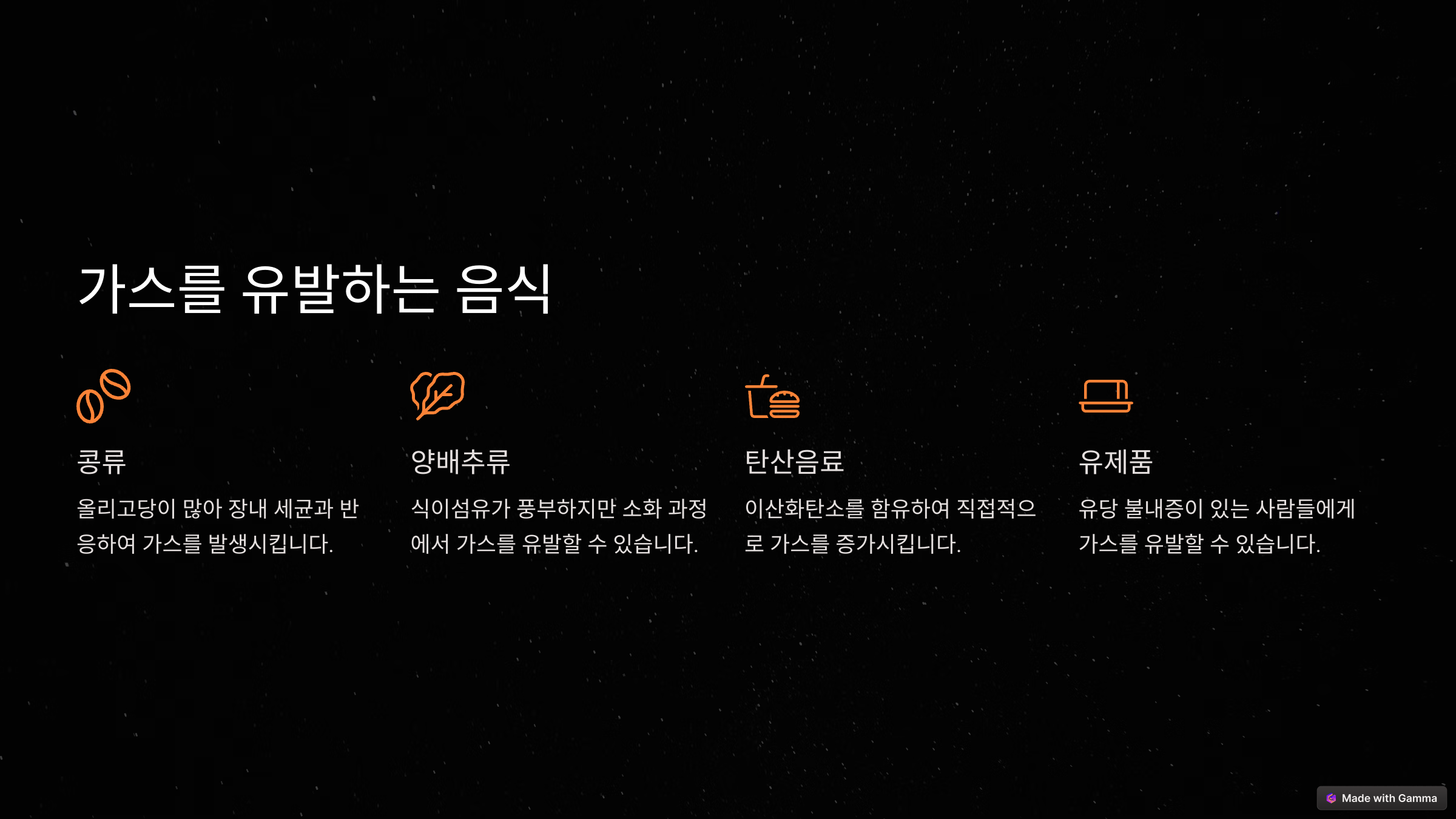 속이 더부룩한 이유가 사람마다 다를 수 있기 때문에, 내 증상에 맞는 원인을 찾아 해결하는 것이 중요해요! 다음으로 가스를 유발하는 음식들을 살펴볼까요? 🍎