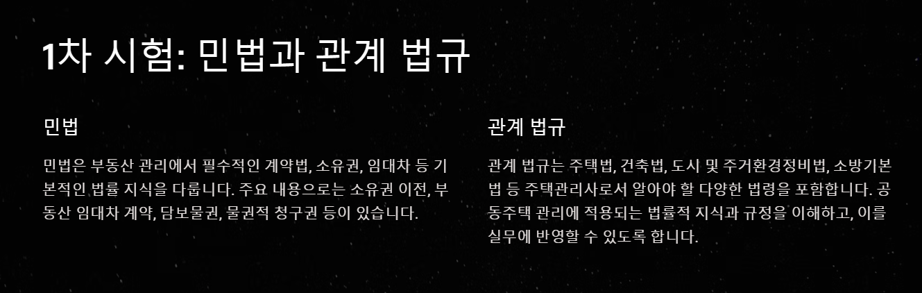 - 민법과 관계 법규는 주택 관리에 필요한 법률적 기초를 다루며, 민사 관계와 주택 관련 법령을 학습하는 데 중점을 둡니다.