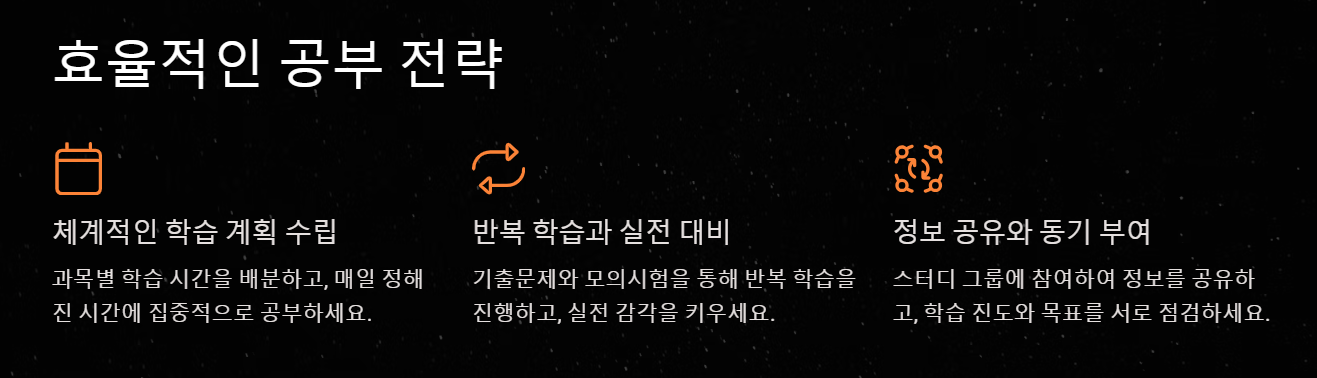 - 과목별 학습 시간을 배분하고, 매일 정해진 시간에 집중적으로 공부하세요.