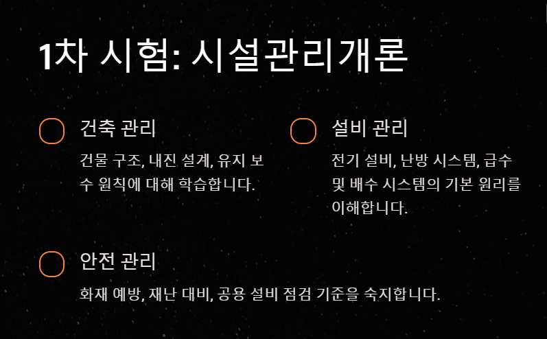 - 시설 유지 관리: 건축, 설비, 전기, 소방 등 다양한 시설의 점검과 유지 보수 절차를 이해해야 합니다.