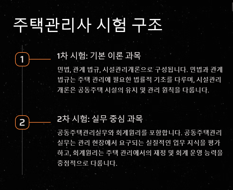 주택관리사 시험은 1차와 2차로 나뉘며, 각 차수는 이론과 실무 능력을 평가하기 위한 과목으로 구성되어 있습니다.