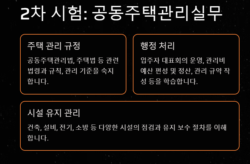 2차 시험은 공동주택관리실무와 회계원리를 포함합니다.