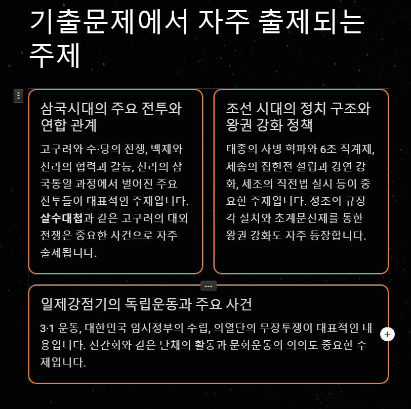 기출문제는 과거의 출제 패턴과 경향을 파악할 수 있는 핵심 자료입니다. 특정 시대, 사건, 인물이 반복적으로 출제되는 경우가 많아 이를 분석하면 시험 준비에 큰 도움을 받을 수 있습니다.