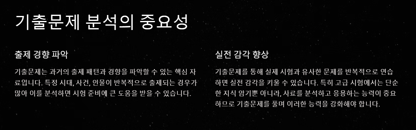 기출문제를 통해 실제 시험과 유사한 문제를 반복적으로 연습하면 실전 감각을 키울 수 있습니다. 특히 고급 시험에서는 단순한 지식 암기뿐 아니라, 사료를 분석하고 응용하는 능력이 중요하므로 기출문제를 풀며 이러한 능력을 강화해야 합니다.