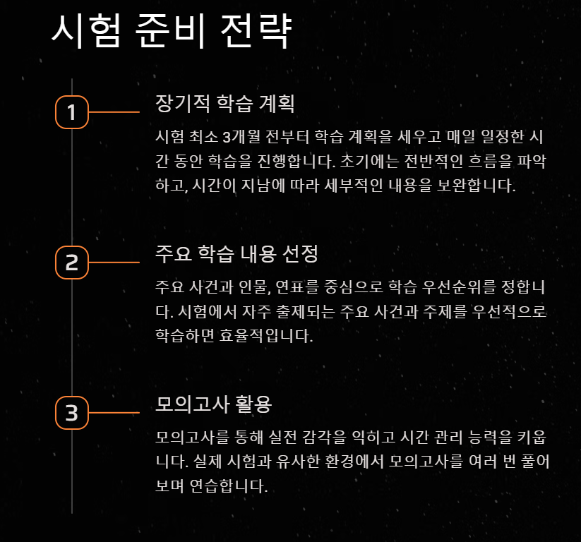 시험 전날에는 새로운 내용을 학습하기보다는, 지금까지 학습한 내용을 체계적으로 복습하는 데 집중해야 합니다. 중요한 연표, 사건, 인물을 정리한 노트를 반복적으로 읽어보며 머릿속에 체계적으로 정리합니다.