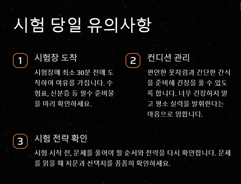 시험 당일에는 시험장에 여유롭게 도착해 안정된 마음가짐을 유지하는 것이 중요합니다. 30분 전 도착을 목표로 하고, 수험표와 신분증 같은 필수 준비물을 반드시 챙기세요.