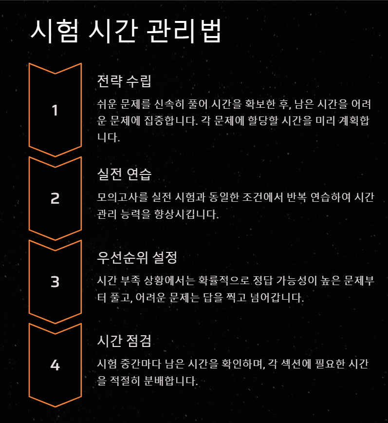 모의고사를 통해 실전 감각을 익히고 시간 관리 능력을 키워야 합니다. 실제 시험과 유사한 환경에서 모의고사를 여러 번 풀어보며, 시험 시간 내에 문제를 해결하는 연습을 합니다.