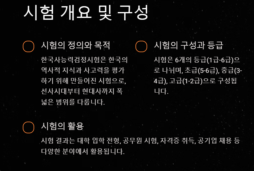 한국사능력검정시험은 역사적 사고력과 분석력을 측정하는 시험으로, 총 6개의 등급(1급~6급)으로 나뉘어 있습니다.