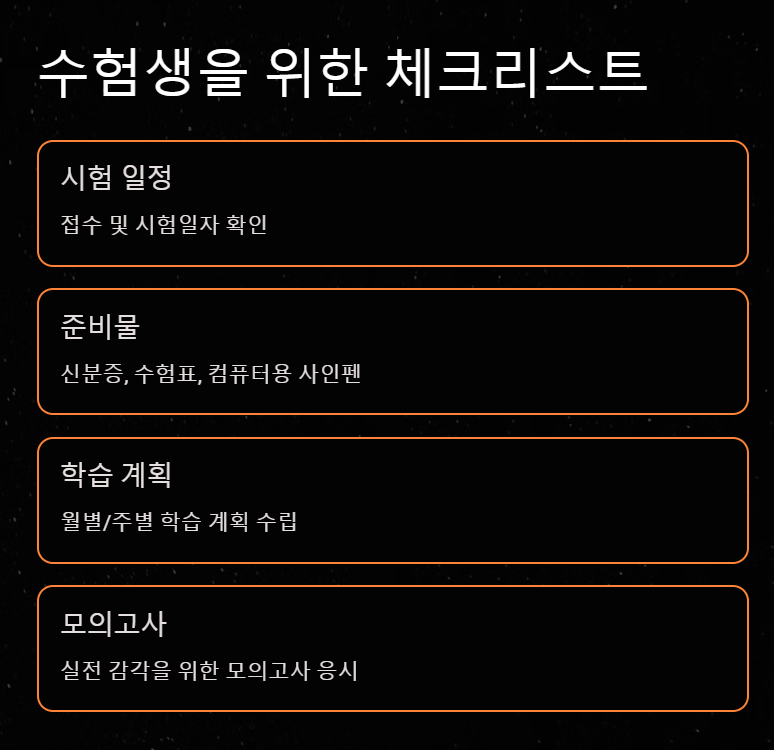 - 준비물: 신분증(주민등록증, 운전면허증), 수험표, 컴퓨터용 사인펜