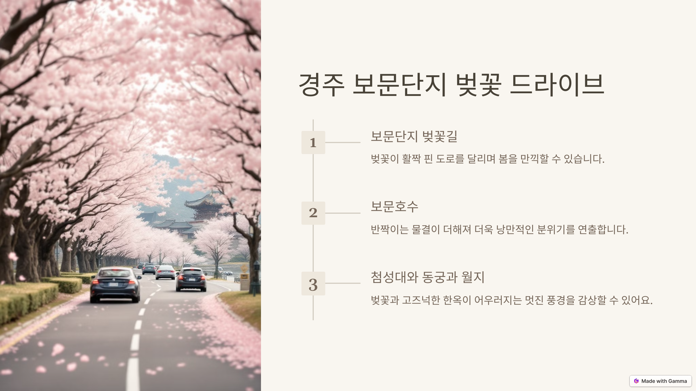 역사와 자연이 어우러진 경주는 3월에 더욱 아름답습니다. 특히 보문단지 벚꽃길은 드라이브 코스로 유명하죠. 벚꽃이 활짝 핀 도로를 달리며 봄을 만끽할 수 있고, 보문호수의 반짝이는 물결이 더해져 더욱 낭만적인 분위기를 연출합니다. 경주의 또 다른 명소인 첨성대와 동궁과 월지에서도 벚꽃과 고즈넉한 한옥이 어우러지는 멋진 풍경을 감상할 수 있어요.