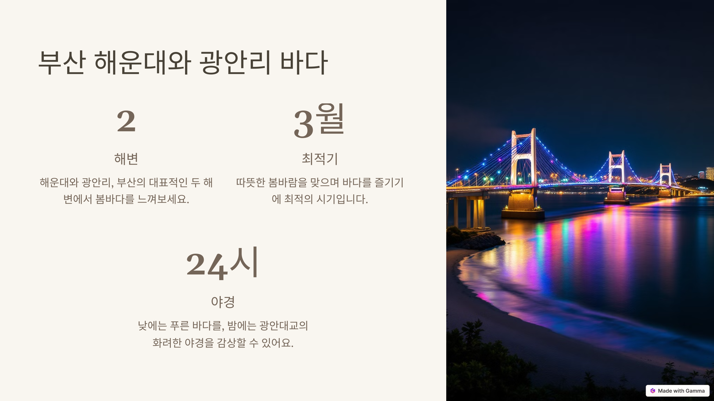 광안리에서는 낮에는 푸른 바다를, 밤에는 광안대교의 화려한 야경을 감상할 수 있어요. 근처에는 감성적인 카페와 맛집이 많아 여유로운 시간을 보내기 좋습니다. 또한, 국제시장과 자갈치시장에서 싱싱한 해산물을 맛보며 부산의 매력을 만끽할 수 있습니다.