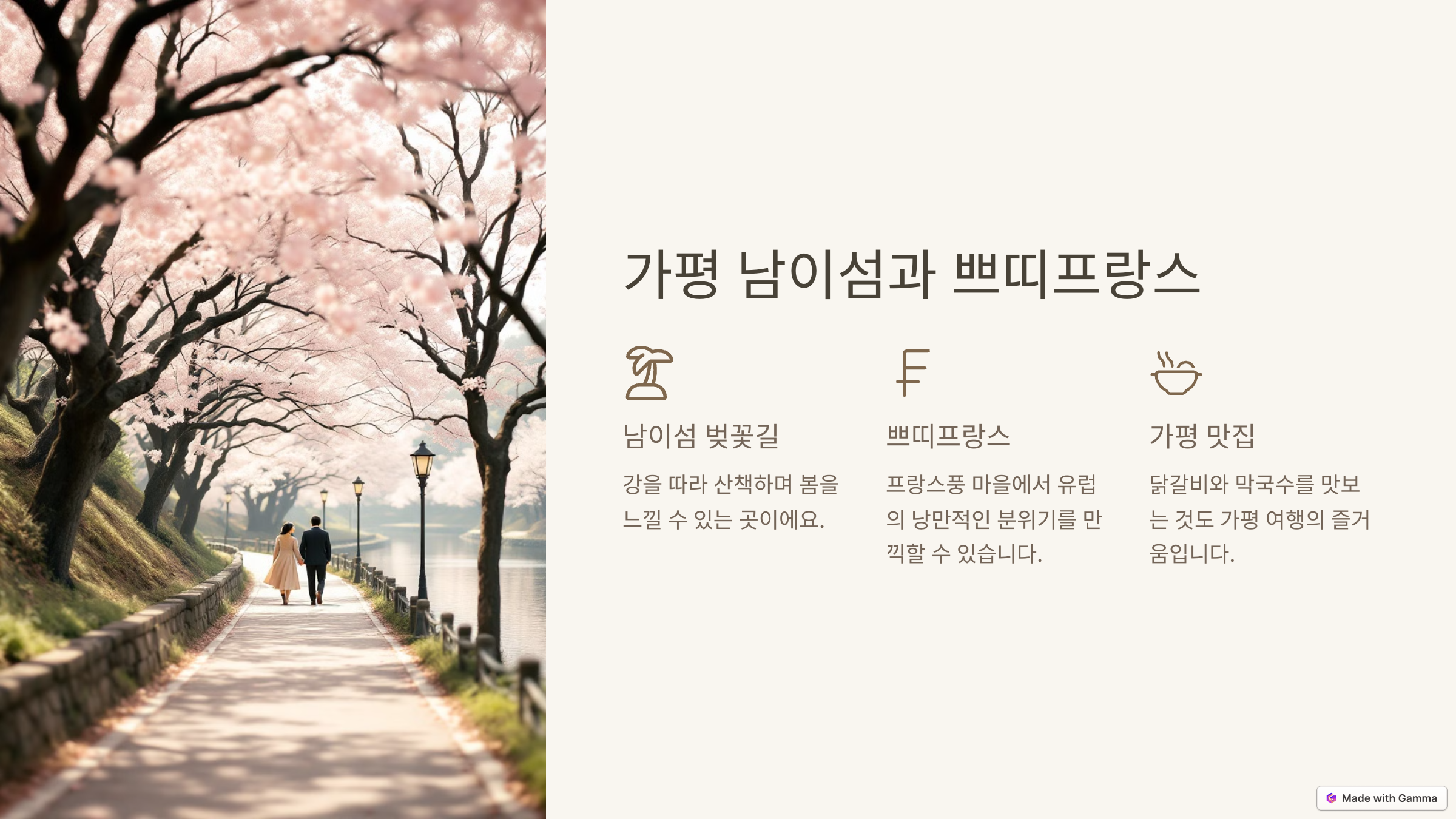 서울 근교에서 하루 만에 다녀오기 좋은 가평은 3월에 더욱 매력적입니다. 남이섬은 벚꽃이 피기 시작하는 시기로, 강을 따라 산책하며 봄을 느낄 수 있는 곳이에요. 또한, 프랑스풍 마을인 쁘띠프랑스에서는 유럽의 낭만적인 분위기를 만끽할 수 있습니다.