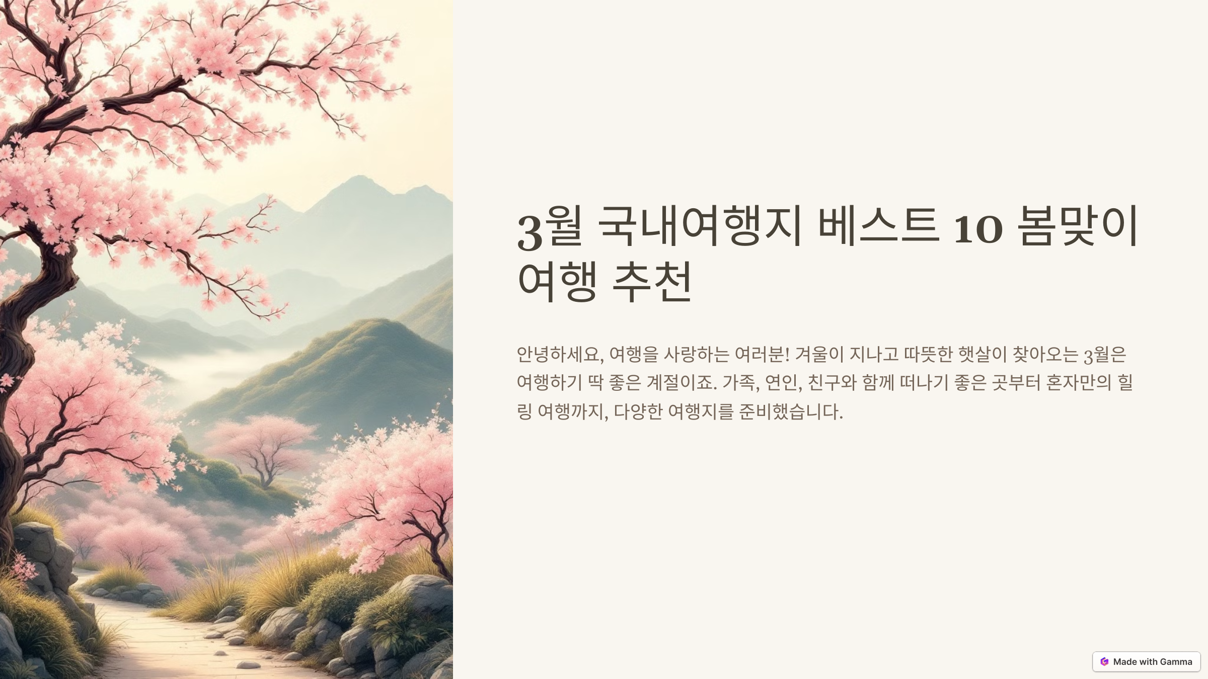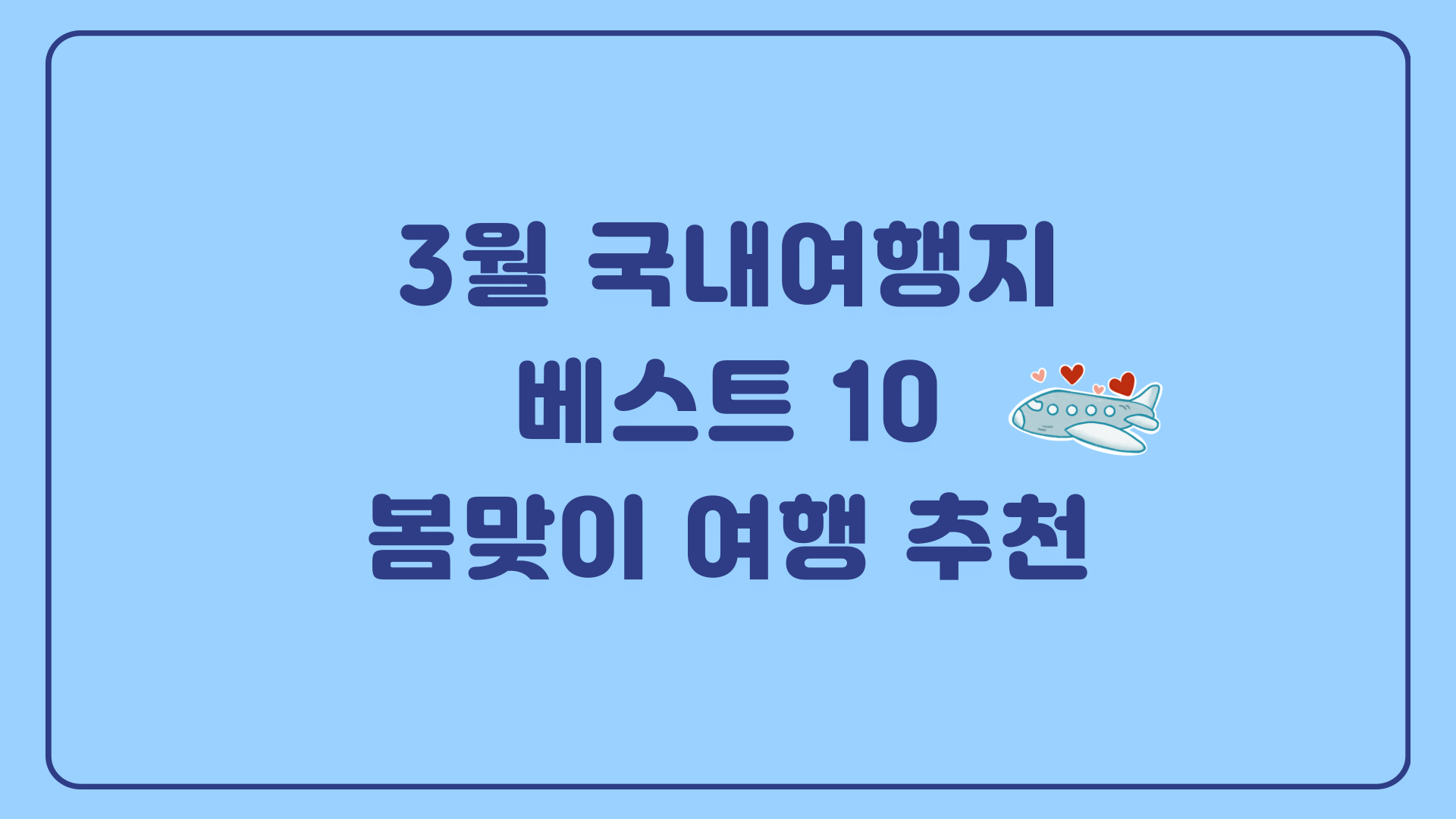 안녕하세요, 여행을 사랑하는 여러분! 겨울이 지나고 따뜻한 햇살이 찾아오는 3월은 여행하기 딱 좋은 계절이죠. 벚꽃이 피기 시작하는 남쪽 지역부터, 산과 바다가 조화를 이루는 아름다운 명소까지, 이번 달에 꼭 가봐야 할 국내 여행지를 소개해 드릴게요. 가족, 연인, 친구와 함께 떠나기 좋은 곳부터 혼자만의 힐링 여행까지, 다양한 여행지를 준비했으니 이번 봄 여행 계획에 도움이 되길 바랍니다. 그럼 바로 출발해 볼까요?