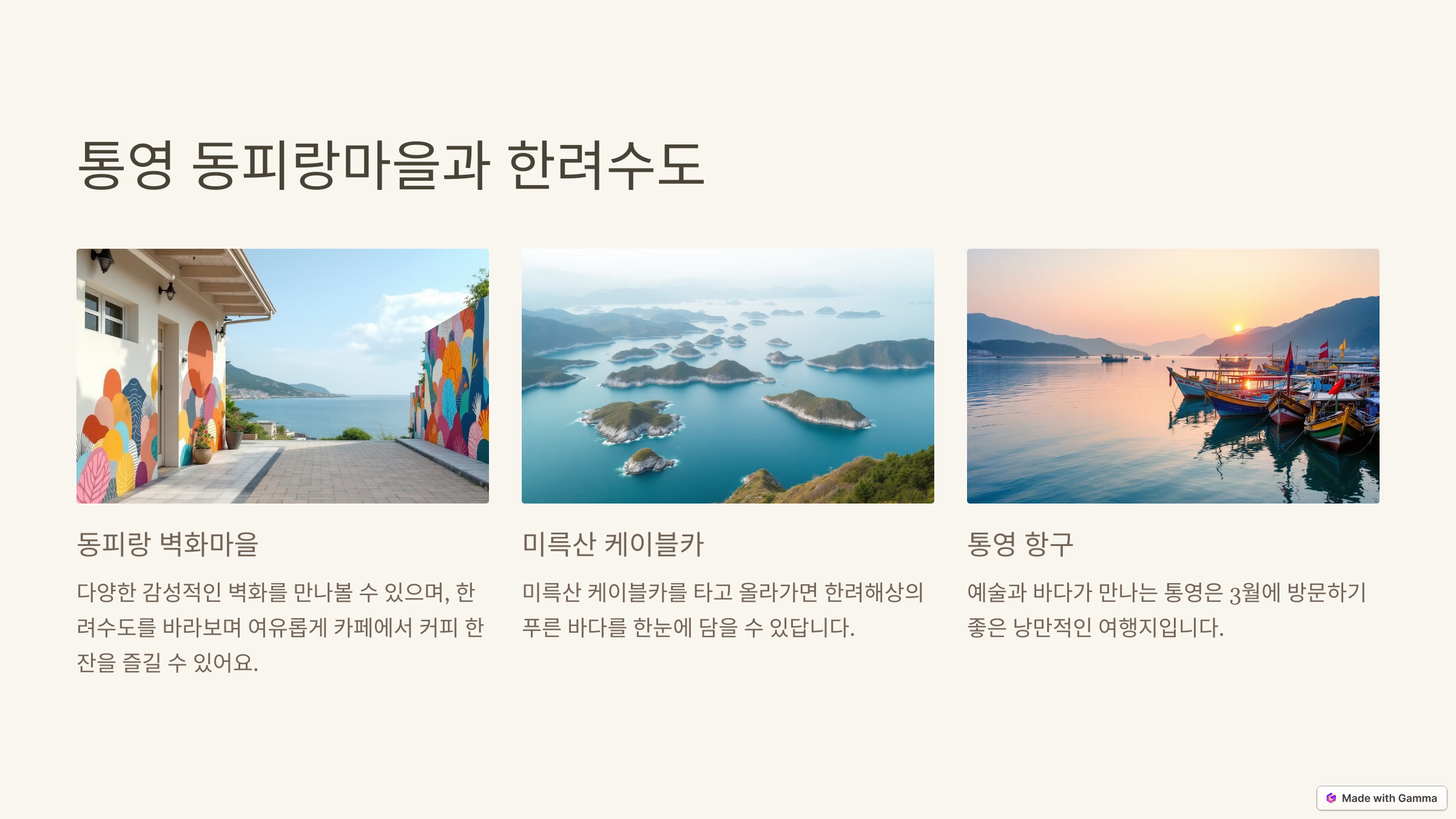 ‘한국의 나폴리’라 불리는 통영은 바다와 예술이 어우러진 낭만적인 여행지입니다. 특히 3월의 통영은 한결 따뜻해진 날씨 덕분에 여행하기 딱 좋은 시기죠. 통영의 대표적인 명소인 동피랑 벽화마을은 알록달록한 벽화들이 골목골목을 수놓고 있어 감성적인 산책을 즐기기에 좋습니다. 이곳은 과거 철거 위기에 놓였던 달동네였지만, 예술가들의 벽화 프로젝트 덕분에 지금은 통영의 대표적인 관광 명소가 되었죠. 마을을 따라 올라가다 보면 정상에서 바라보는 통영항의 풍경이 장관을 이룹니다.