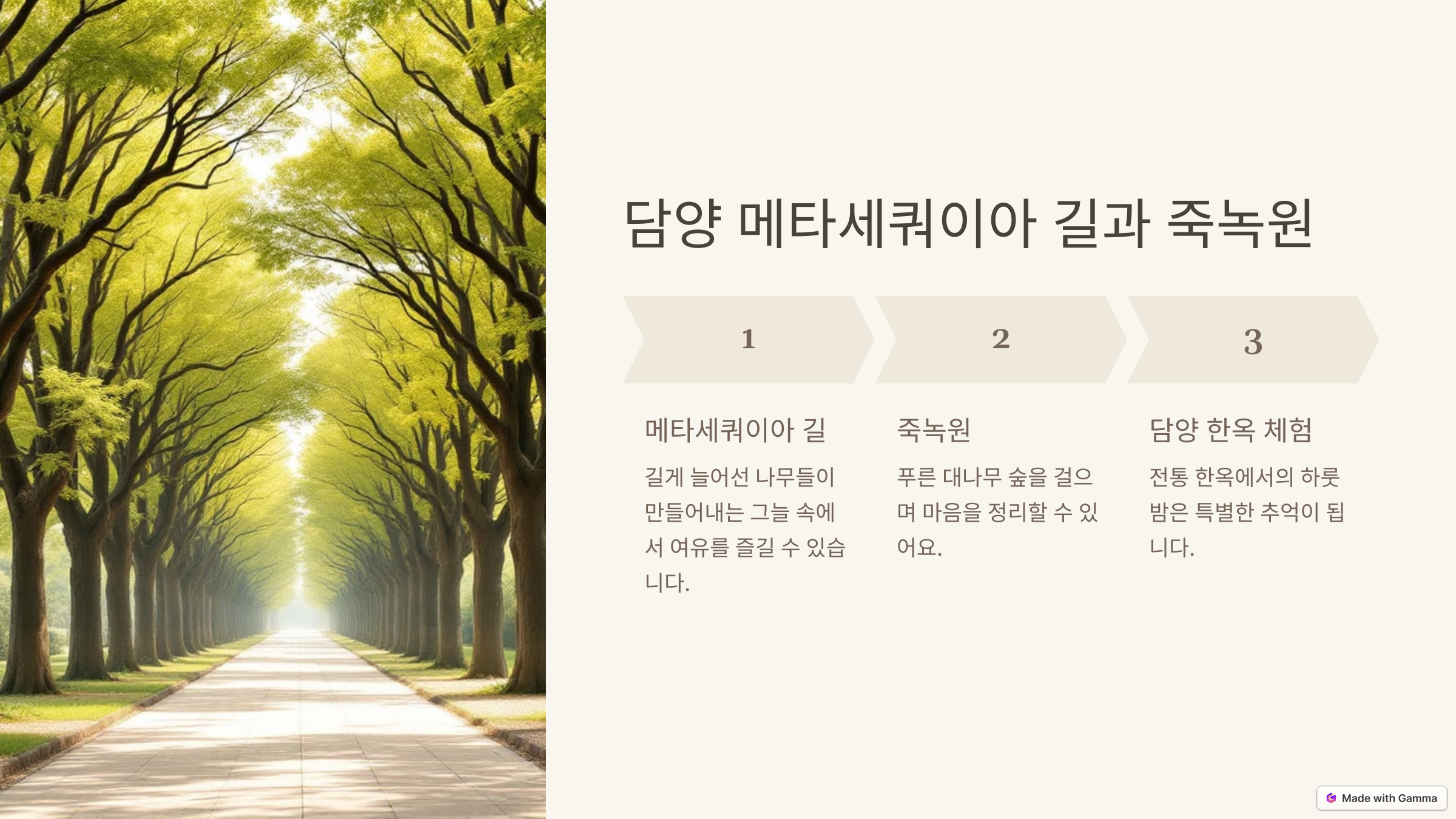 담양은 아름다운 자연과 감성적인 풍경이 있는 곳입니다. 특히 메타세쿼이아 길은 산책하기 좋은 곳으로, 길게 늘어선 나무들이 만들어내는 그늘 속에서 여유를 즐길 수 있습니다. 죽녹원에서는 푸른 대나무 숲을 걸으며 마음을 정리할 수 있어요.